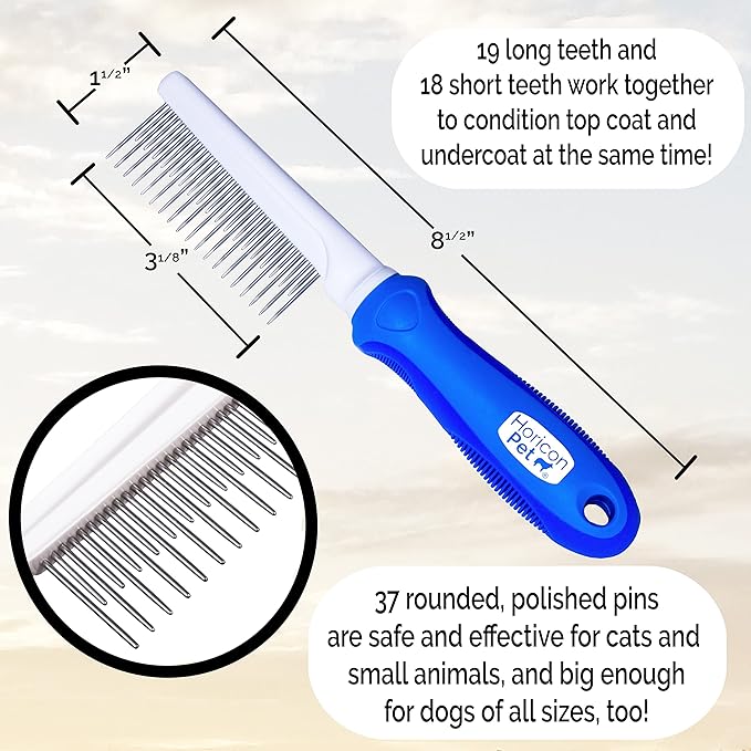 - Long and short pins allow combing of top coat and undercoat to detangle fur and prevent matting.