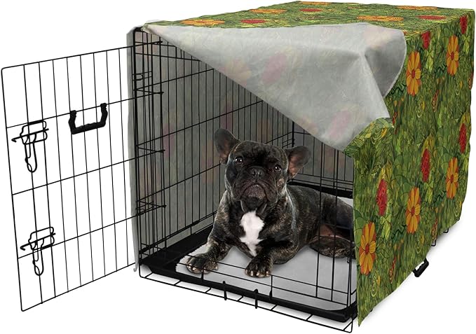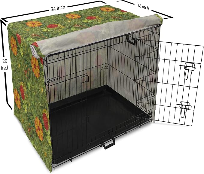 Ambesonne Floral Dog Crate Cover, Funky Flower Foliage Bush with Fractal Retro Jungle Art Design, Easy to Use Pet Kennel Cover for Cats & Medium Dogs, 24 Inch, Olive Green