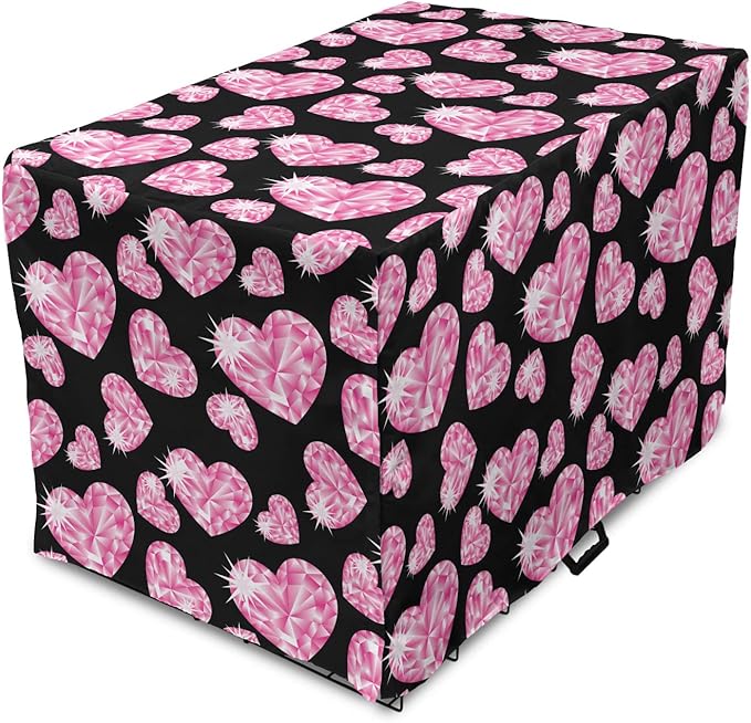 Ambesonne Diamonds Dog Crate Cover, Romantic Pink Heart Stones on Black Background Valentines Day Theme, Easy to Use Pet Kennel Cover for Medium Large Dogs, 48 Inch, Pink Black