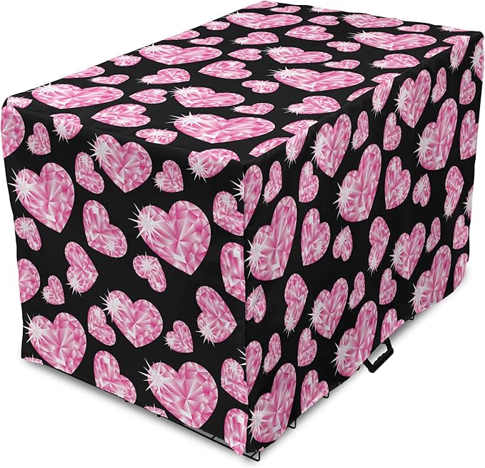 Ambesonne Diamonds Dog Crate Cover, Romantic Pink Heart Stones on Black Background Valentines Day Theme, Easy to Use Pet Kennel Cover for Medium Large Dogs, 42 Inch, Pink Black