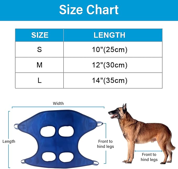- -In order to get the right size, measure the spacing between your pet’s front legs & rear legs. Leg spacing: Small-5.5 inches/ Medium-6.3 inches/ Large-6.7 inches