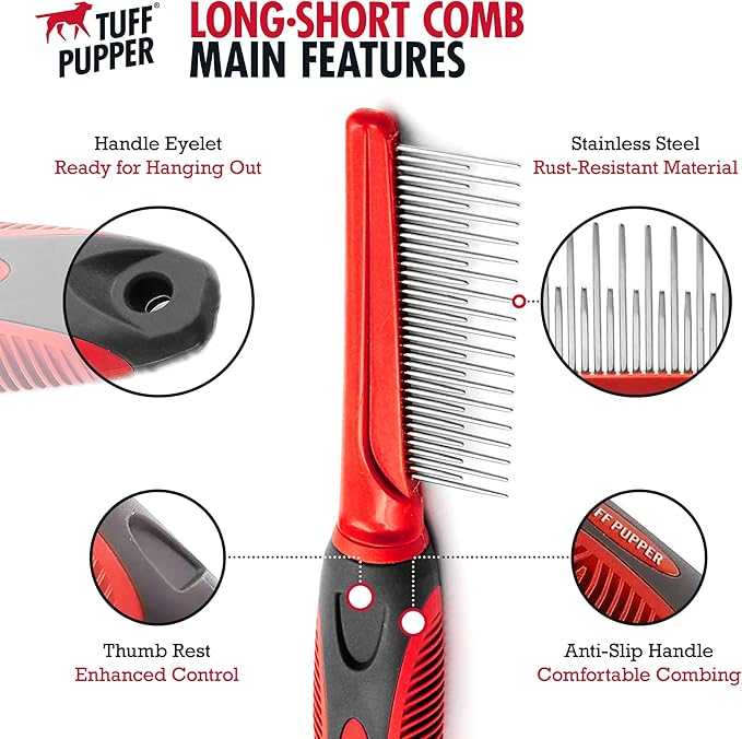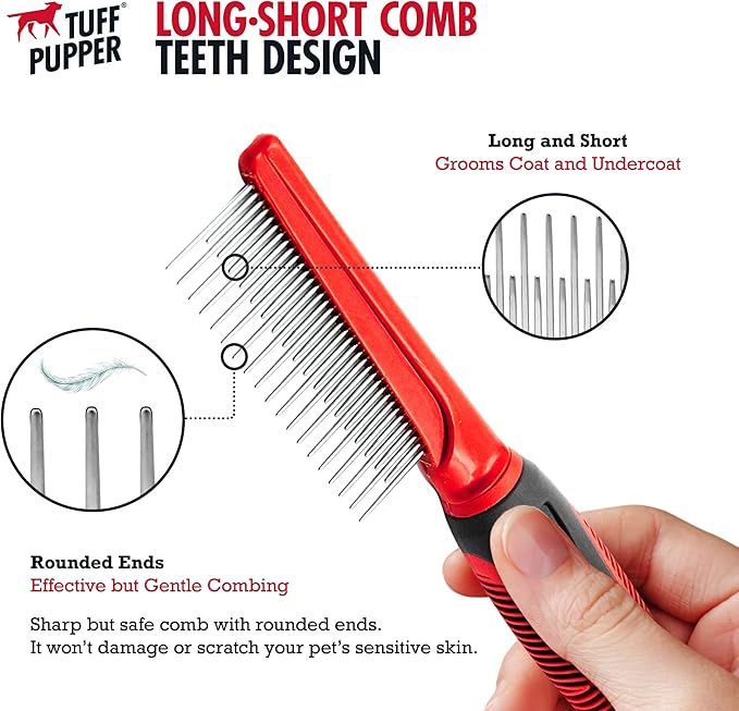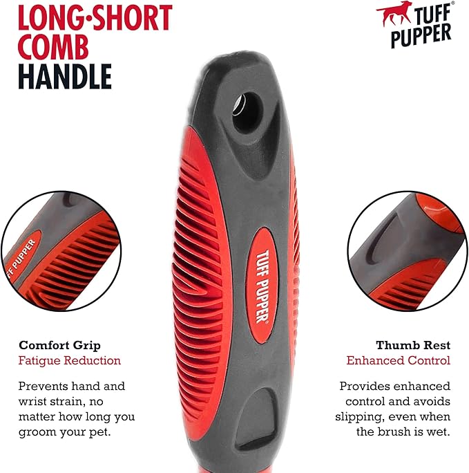 Tuff Pupper Dual Length Detangling Dog Comb | Short and Long Teeth Outer & Inner Coat | Ergonomic Pet Detangling Combs | No-Slip Safety Handle For Precision Control | Rounded Tips Prevent Scratching