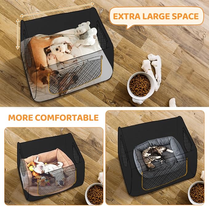 - SET UP & FOLD IN SECONDS: Our extra-large pet tent pops open in seconds with no tools required, making setup effortless whether you’re at home or on the go. The support rods can be inserted for extra stability. When it’s time to pack up, simply fold it flat into the included carry bag for easy storage and travel.