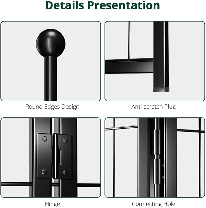 - Stable & Safe: The dog fence uses heavy metal with thickened iron tube for stability and anti-collapse. The metal surface is smooth, with no rough or sharp spots, and the metal stakes have rounded ball heads to avoid harm if the pet jump out of the fence