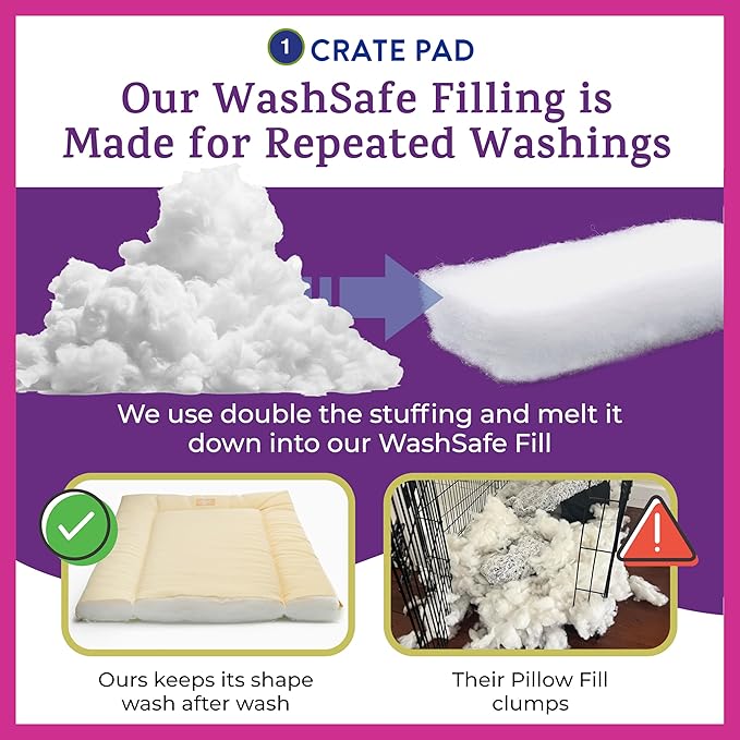 - ๐๐ซ๐๐ฆ๐ข๐ฎ๐ฆ ๐๐ฎ๐๐ฅ๐ข๐ญ๐ฒ: Invest in a Crate Set that's built to last. We don't cut corners, our Crate Bumpers are filled with extra dense fiber to protect your dog against the hard metal crate bars, they are up to 50 percent taller and thicker than other products with 9 Pieces of Velcro because ties come off easily. Our Crate Covers are made of real fabric not polyester coated in toxic PVC. Our Crate Pads are made for Unlimited Washes! Our special fill will never bunch up or get lumpy after washing compared to beds filled with loose fiber fill. We only use premium fabrics that don't pill, shed, or mat so they look new for years and are completely washable.