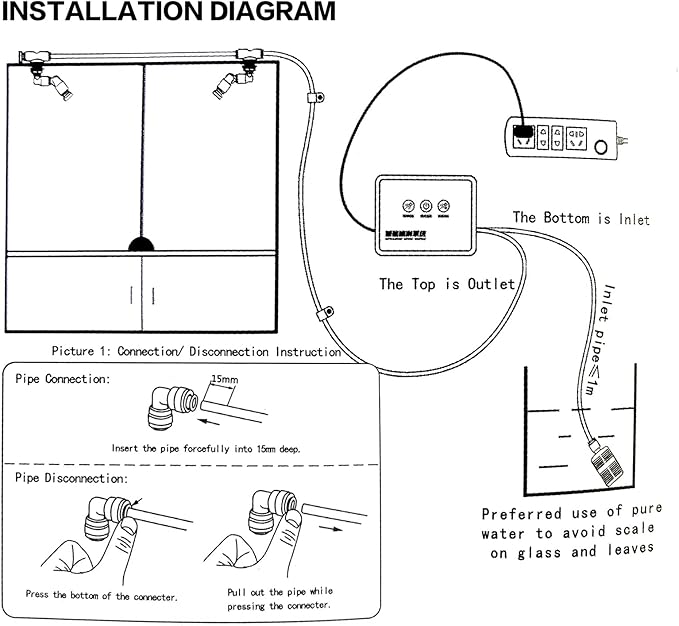 - 【MYGIIKAKA Automatic Reptile Mister】Please refer to the manual for install the reptile humidifier and pay attention to the connection of the water pipe to the water inlet/outlet. When inserting the water pipe, if there is resistance, you need to insert it a little more forcefully to lock it in place. It is recommended to keep the host away from the terrarium when installing the reptile mister, to avoid affecting the reptile when the host is running.