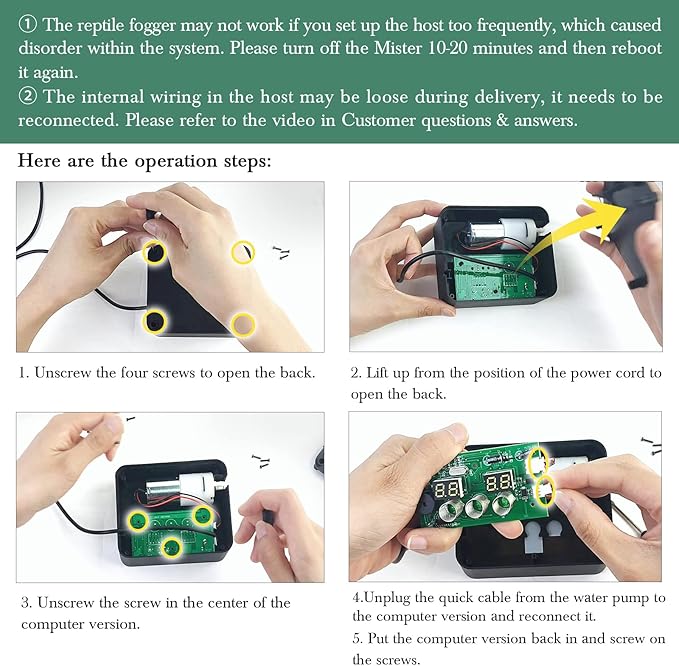 - 【Product Testing】Each reptile misting system will be product tested and it may leave water droplets, please don't worry, all we offer are brand new products. If you have any questions about our reptile fogger, please feel free to contact us.