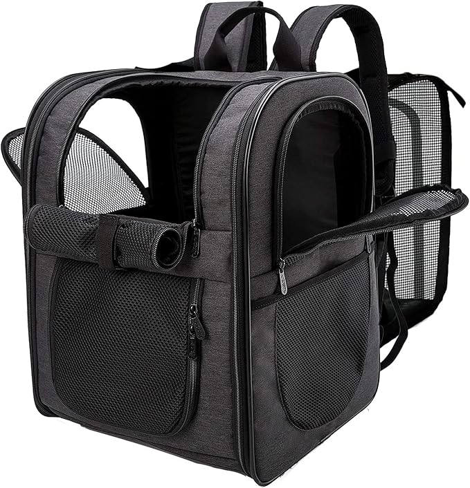 - BETTER CONSTUCTION-Well ventilated design for optimal airflow, two-way entry for easy access, top mesh window for more headroom and visibility, and thick, soft fleece bedding for your pet resting and relaxing. This backpack is firmly structured, providing ample room for your pet to move around.