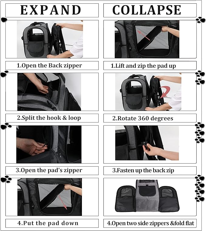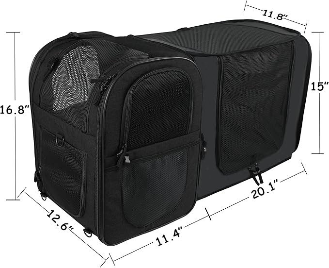 - EXPANDABLE & FOLDABLE-Apollo Walker expandable pet carrier(bag size 11.4" x 12.6" x 16.8"), additional expansion part size is about 20.4" x 11.8" x 15", which gives your pet more resting space, increasing air circulation, allowing your pet to move more comfortably and reducing anxiety.