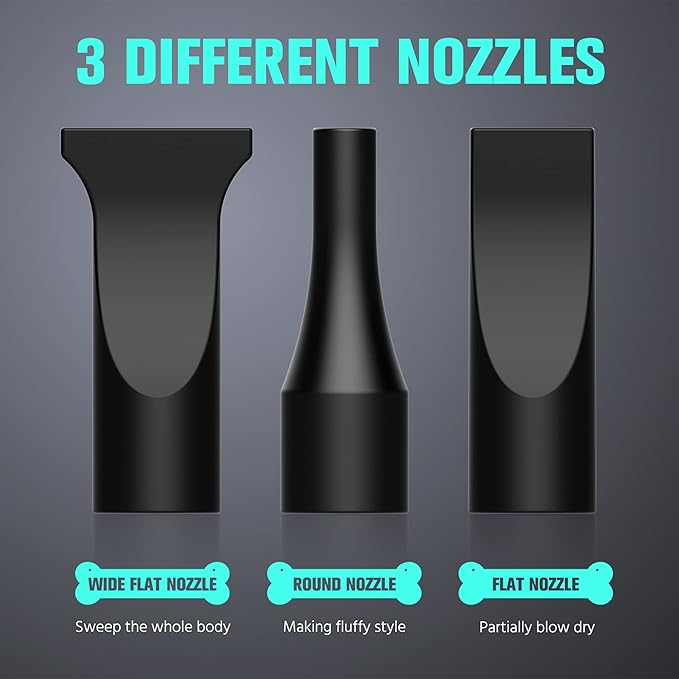 - 3 NOZZLES & FEXIBLE SPRING HOSE: Different nozzles meet all the needs of different pets; Thickened compound hose to resist high temperature, the hose is lengthy and flexible so you’ll have no snags drying your dog even if he usually wriggles around when you’re grooming him.