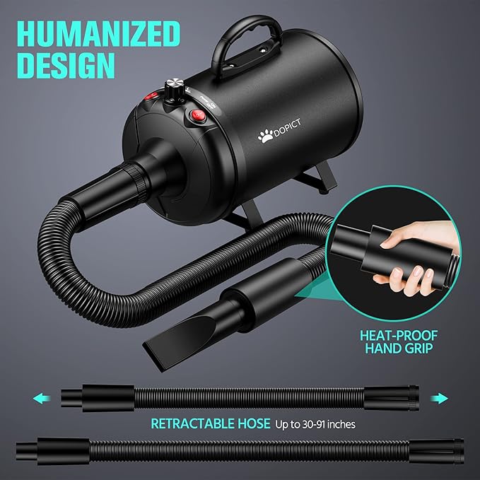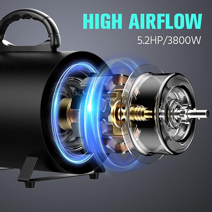 - 5.2HP/3800W POWERFUL BLOW FORCE: The powerful motor develops 5.2 HP giving you more than enough oomph to quickly dry even heavier dog coats. Powerful horsepower, remove dust, allergens and dead fur from you dog’s coat, they’ll save you money!