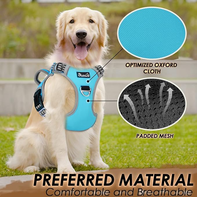 - 【HIGH-END MATERIAL】--- Made of 100% polyester, scratch-resistant Oxford mesh fabric and soft sponge, our large padded dog harness is lightweight, breathable, durable and skin-friendly. This easy walk harness will protect the spinal nerves of the dog and provide all day comfort for your pet friend.