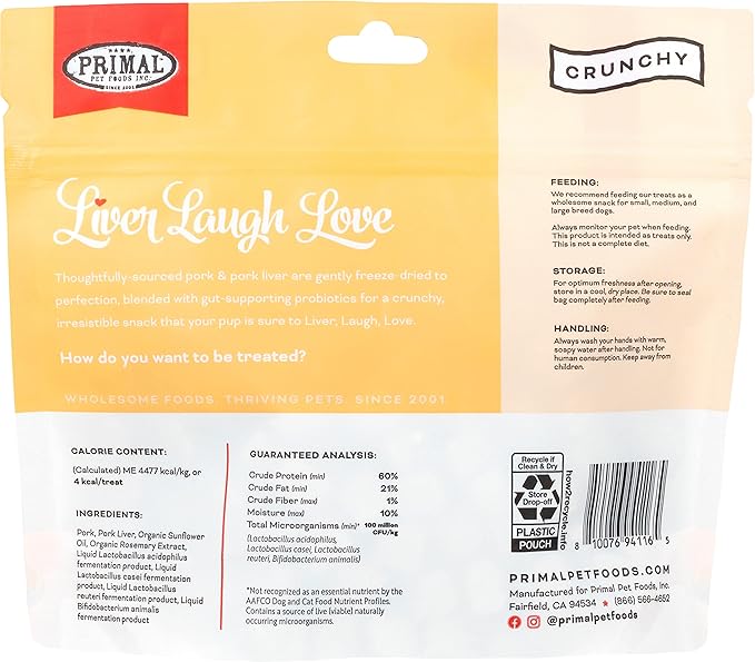 Primal Freeze Dried Dog Treats; Pork Liver Dog Treats with Probiotics for Dogs; Liver, Laugh, Love; Crunchy Grain Free Training Treats for Dogs, 1.5 oz