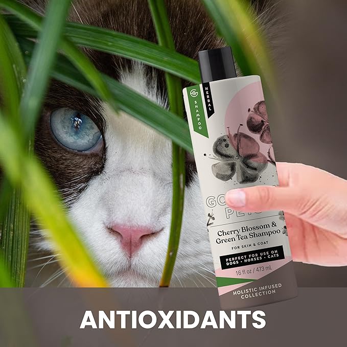 - What's Included: 16 oz. holistic natural Cherry Blossom and Green Tea Shampoo. Beneficial for pets with oily skin, redness, sun damage, or sensitive skin