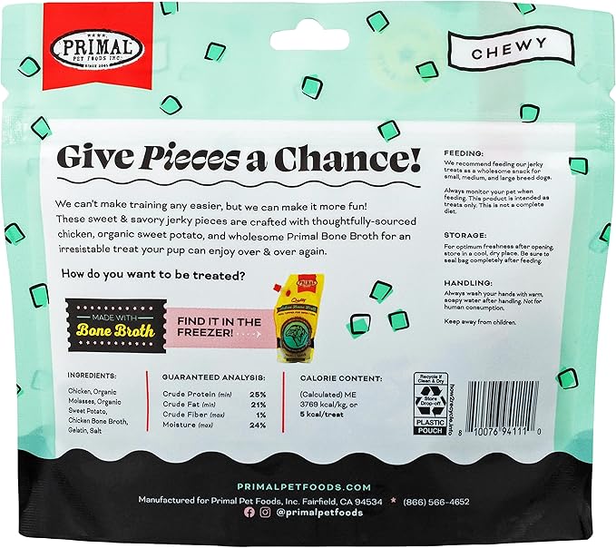 - Irresistible flavor dogs love. Our chicken dog treats are made with real Primal Bone Broth and organic sweet potato for dogs