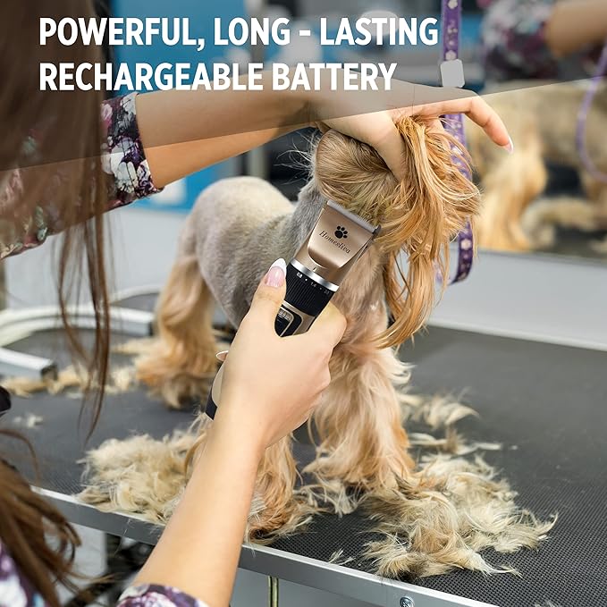 - ✄Built-in Batttery: Rechargeable dog trimmer with built-in battery is good for exceptional flexibility. It can also be used when charging so you don't have to worry that it will stop working while charging and you'll have half groomed dog. When charged for up to 2.5 hours, can sustain use of 150 minutes and with rechargeable design of this dog clipper, you don't have to replace batteries.
