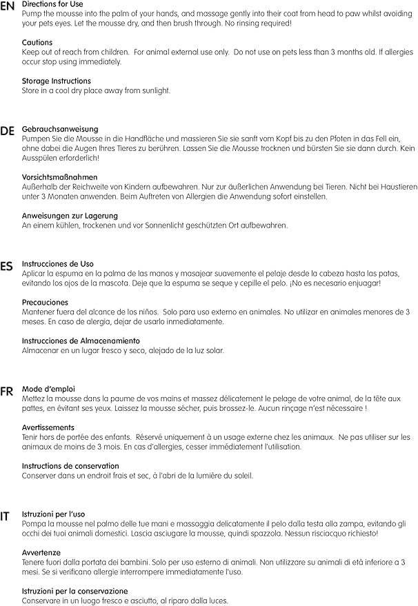 - Easy Application: Pump the mousse into the palm of your hands, and massage gently into their coat from head to paw whilst avoiding your pets eyes. Let the mousse dry, and then brush through.