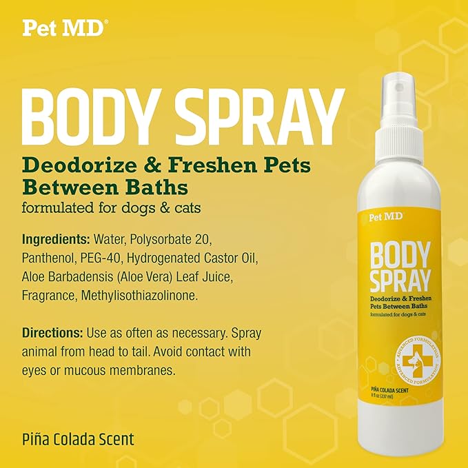 Pet MD Body Spray for Dogs & Cats - Deodorizing Dog Perfume Reduces Static & Eliminates Odor - Long Lasting Pet Cologne Spray for Dogs - Pina Colada Scent - 8 oz