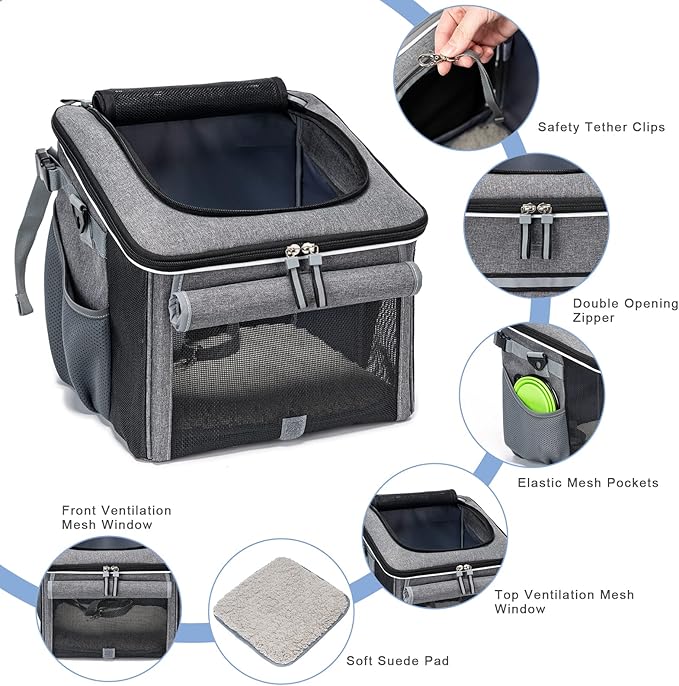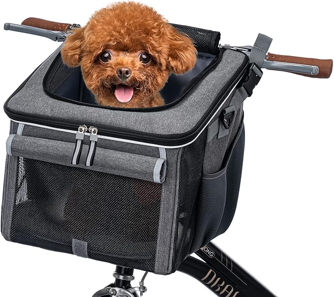 Dog Bike Basket, Soft-Sided Dog Bike Carrier with 4 Mesh Windows for Small Dog Cat Puppies - Grey