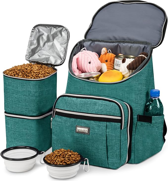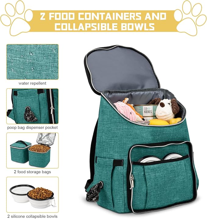 BAGLHER Travel Dog Backpack - Detachable Travel Dog Food Container for Pet Supplies Dog Gear Backpack,Dog Bag for Traveling with 2 Silicone Collapsible Bowls and 2 Food Baskets Green