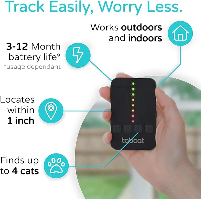 - TRACK YOUR CAT EASILY: TabCat helps you quickly and accurately locate your cat or kitten, whether they are hiding indoors or exploring outdoors. The small and lightweight tag (only 0.2 ounces!) ensures your pet's comfort while providing precise tracking. The handset can track up to 4 cats, meaning you can track your whole clowder with one device