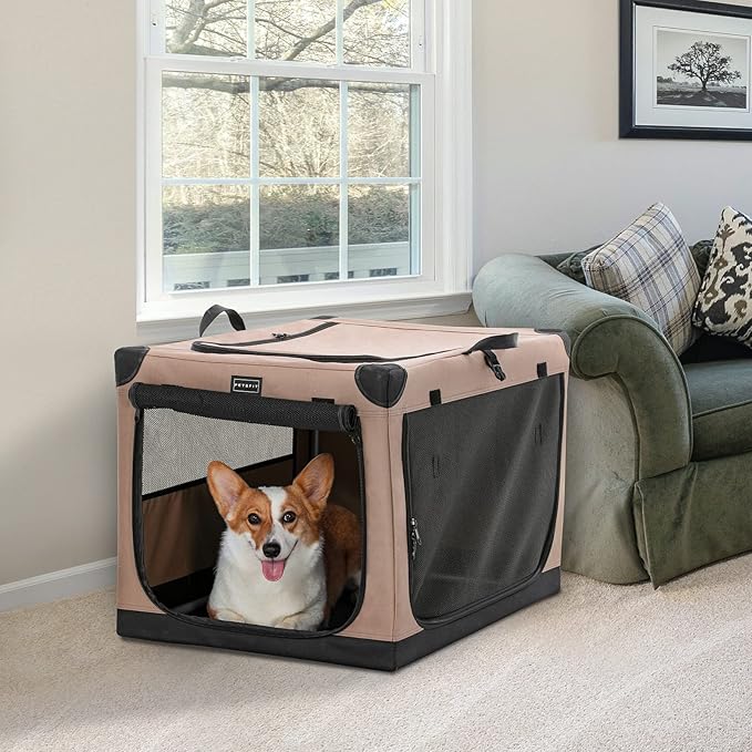 PETSFIT Portable Dog Crate, with Patented Adjustable Fabric Cover, Chewproof & Lockable Mesh Doors, Waterproof Base Collapsible Kennel Khaki 30 Inch