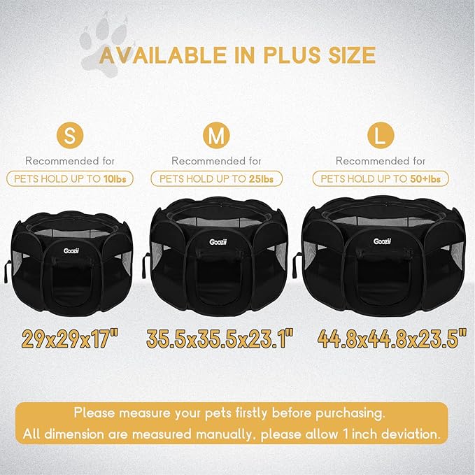 - 【Spacious & Comfort】: This dog playpen keeps your pet stay in this pet playpen secure, spacious interior give more fun for your pet. Size is 29*29*17 inches, great for small animals up to 10 LB. There are 1 inch error range because of technical issue. The portable cat playpen is also a ideal present for cat lovers as Christmas gifts.