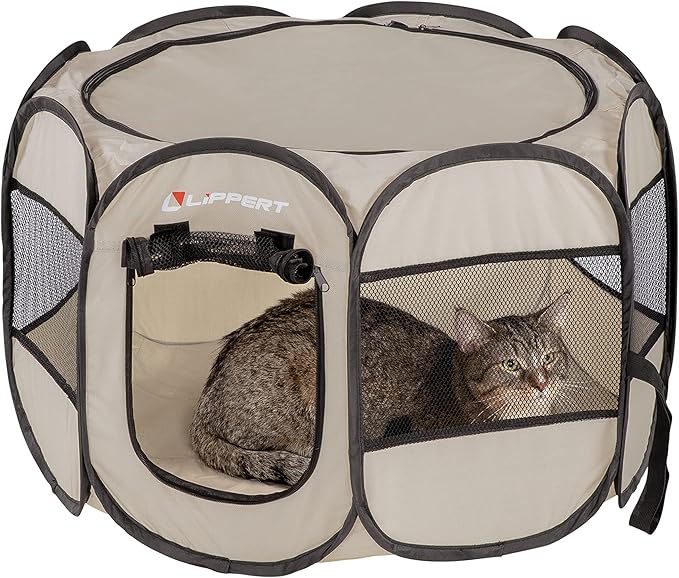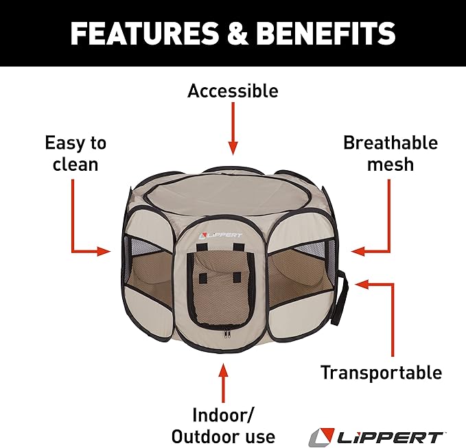 - INDOOR/OUTDOOR USE – The Lippert portable pet playpen makes a perfect enclosed space for your pet to play inside or outside your home. You can even pack it up and take it on your next trip to the beach, park or campground