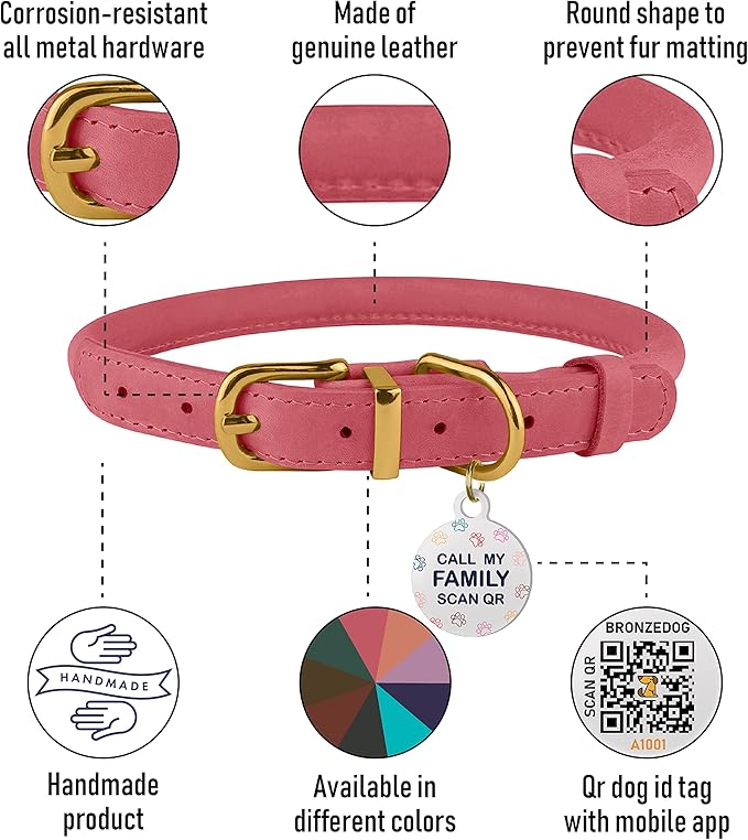 BRONZEDOG Rolled Leather Dog Collar with QR ID Tag Adjustable Soft Round Collars for Small Medium Large Dogs Puppy Cat (11" - 14 1/2" Neck Size, Coral Pink)