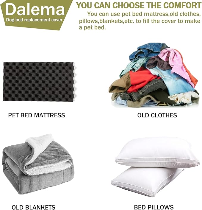 - 【DIY do it yourself dog bed】:This listing is replacement dog bed cover only,without inserts or fillers.It can filled with any what's you want such as blankets,pillows,old clothes,shredded foam or any dog mattress to make a comfortable,stylish and easy to maintain bed for your pet.