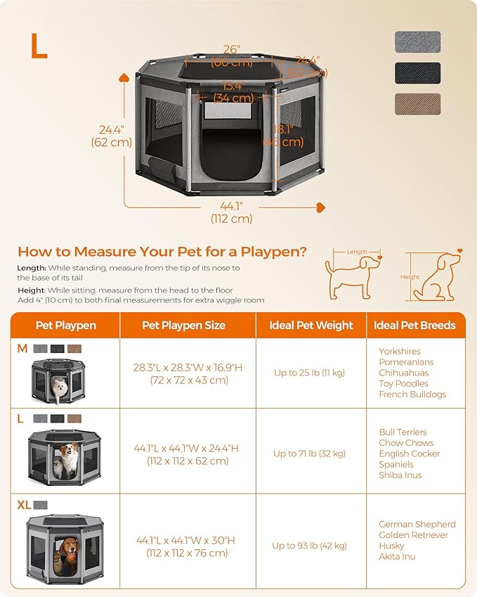 - [Spacious] Measuring 44.1" x 44.1" x 24.4", this dog fence is suitable for cats and small or medium dogs up to 71 lb, such as Bull Terriers, Chow Chows, English Cocker Spaniels, Shiba Inus, etc. Choose the right size based on your pet's measurements