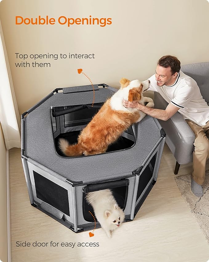 Feandrea Dog Playpen, Oxford Fabric Dog Fence, Octagon Dog Crate, L, 44.1 x 44.1 x 24.4 Inches, PVC Pipe Frame, Breathable Mesh, Double Openings, Dove Gray and Slate Gray UPDC003G01