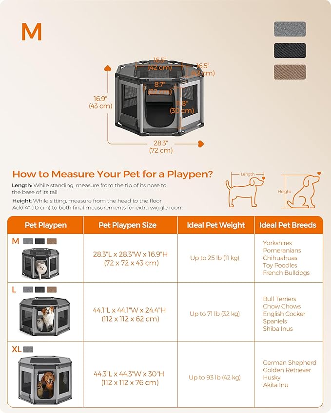 - [Spacious] Measuring 28.3" x 28.3" x 16.9", this dog fence is suitable for cats and small dogs up to 25 lb, such as Yorkshires, Pomeranians, Chihuahuas, Toy Poodles, French Bulldogs, etc. Choose the right size based on your pet's measurements