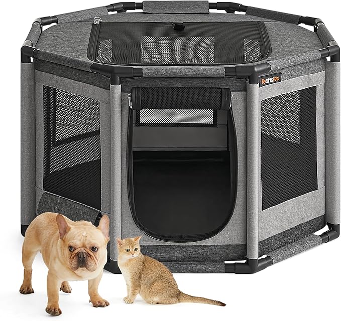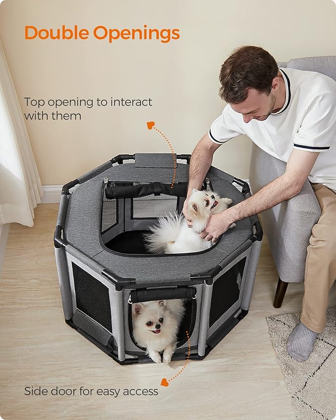 Feandrea Dog Playpen, Oxford Fabric Dog Fence, Octagon Dog Crate, M, 28.3 x 28.3 x 16.9 Inches, PVC Pipe Frame, Breathable Mesh, Double Openings, Dove Gray and Slate Gray UPDC002G01