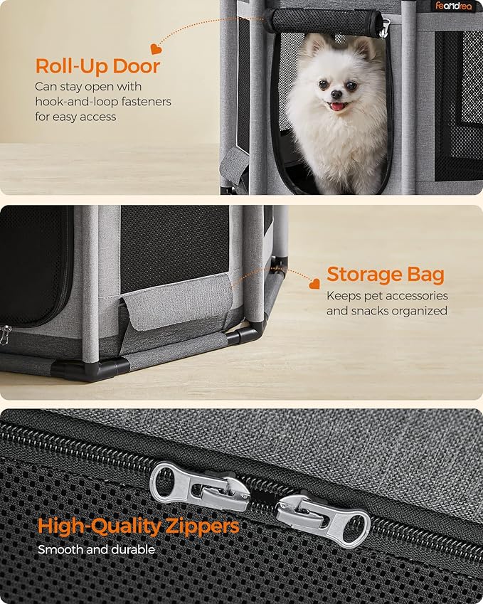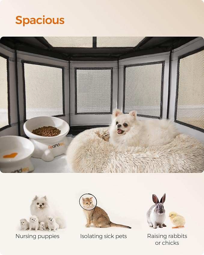- [Versatile] With zippered openings on the top and side, this pet playpen, with the included storage bag, is perfect for many pet-related needs. Use it as an open playpen, a bed to sleep in, a secure nursing spot for dog moms, or a recovery pen