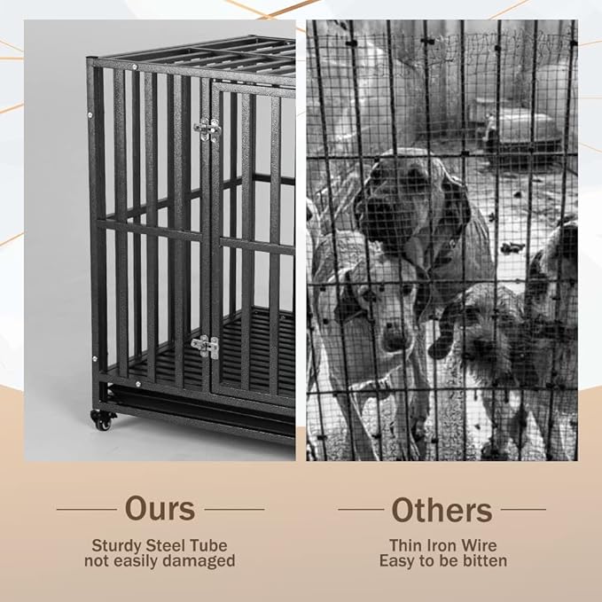 - Dimensions: The heavy duty dog cage measures 43.3"L X 29.9"W X 34.6"H, internal height of the dog cage (excluding wheels) is 32.2"H, providing enough space for your dog. Our big dog crate with wheel is ideal for most medium and large dogs. Equipped with a 3-year warranty, if you have any questions, please contact us immediately, we will reply to you within 24 hours