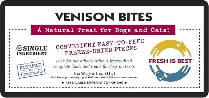 - Venison Bites - This 3 oz bag contains only fresh freeze dried high quality venison meat. All natural raw meat, no added hormones, preservatives, or fillers. 100% grain, gluten and starch free, human quality ingredients.