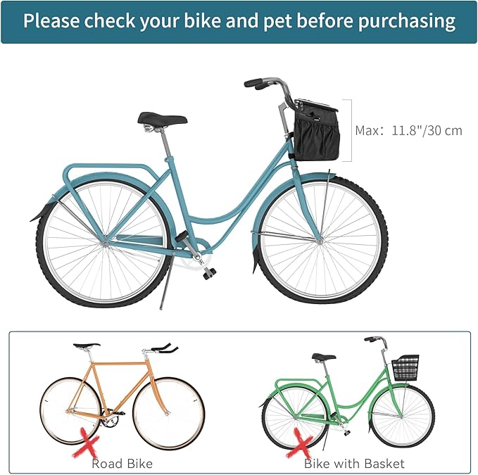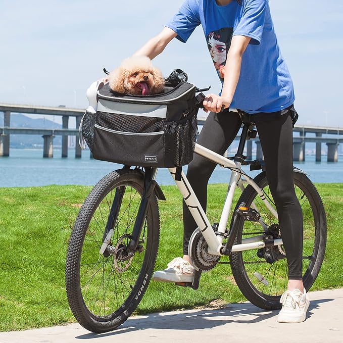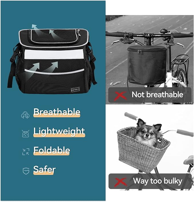 - LIGHTWEIGHT & BREATHABLE:This dog basket for bike is compact, lightweight construction won’t slow you down as you pedal your pupper around town. Our dog bike basket comes with a Large zippered mesh top and front mesh window to allow airflow and keep your canine cool.
