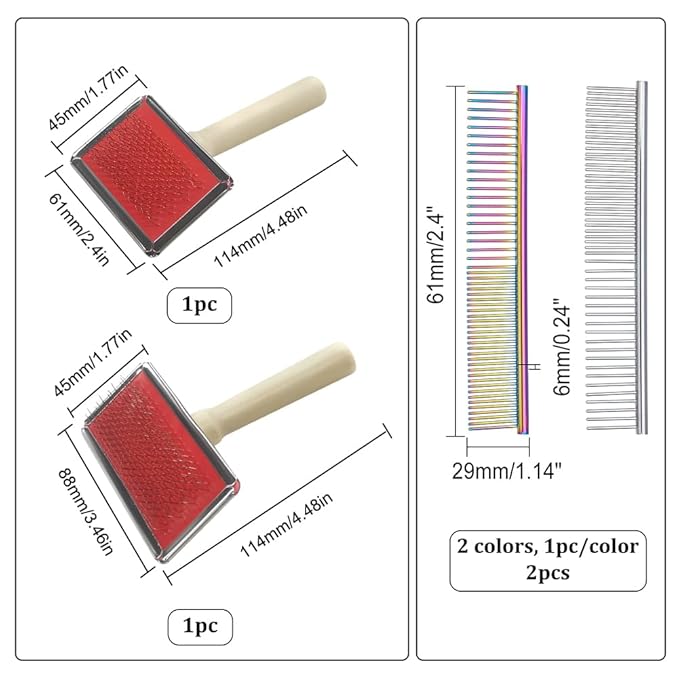 - Size Information: Stainless Steel Pet Combs with Wooded Handle is about 125x61x25mm, head: 61x43mm, and Stainless-Steel Pet Combs is about 112x88x23.5mm, head: 88x44mm.
