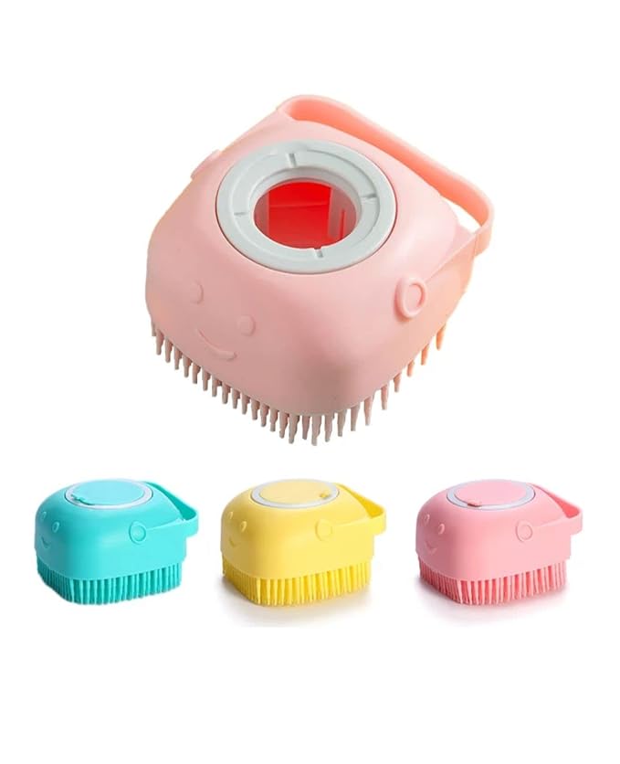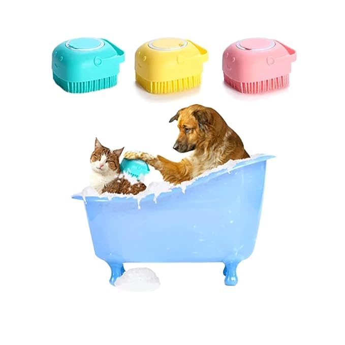 - [HIGHLY CONVENIENCE]- The design provides an easy non-slip hand grip to grasp the brush while cleaning. Gently squeeze the brush to dispense shampoo on your dog while brushing. This dog bathing brush is very gentle and soft to make bathing time comfortable, relaxing, and effective.