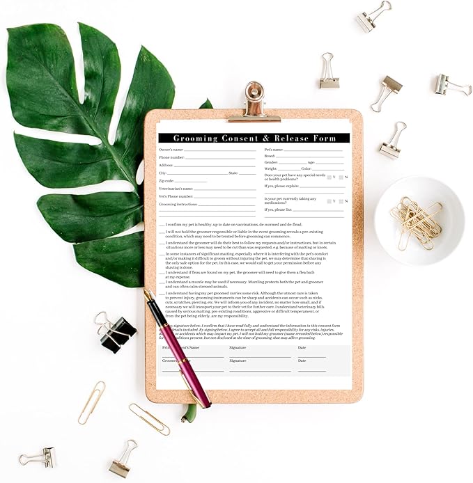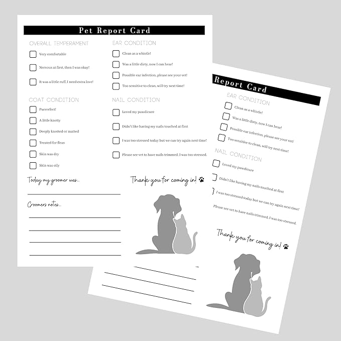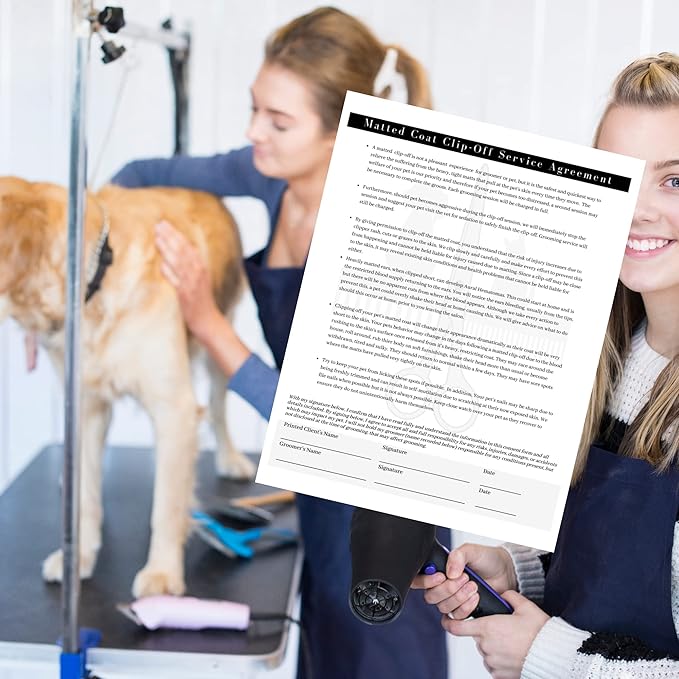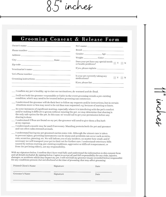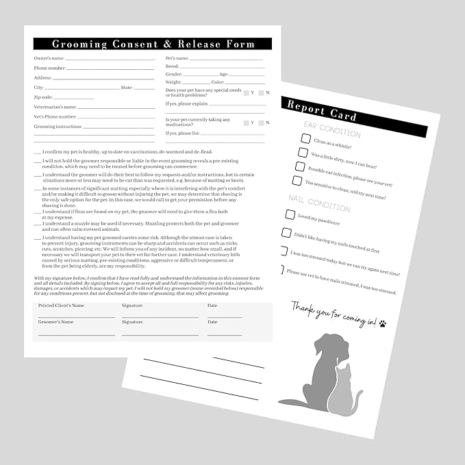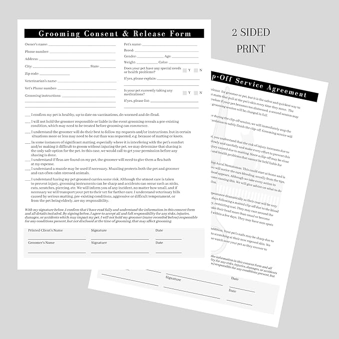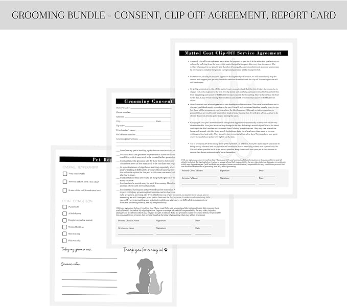Pet Grooming Intake Forms, Consent & Release, Matted Coat Clip-Off Agreement, Pet Report Card | 50 pk, 25 of each, dbl sided | 8.5x11” Groomer Signature Client Grooming Tips Black and White Minimalist