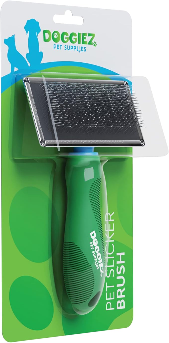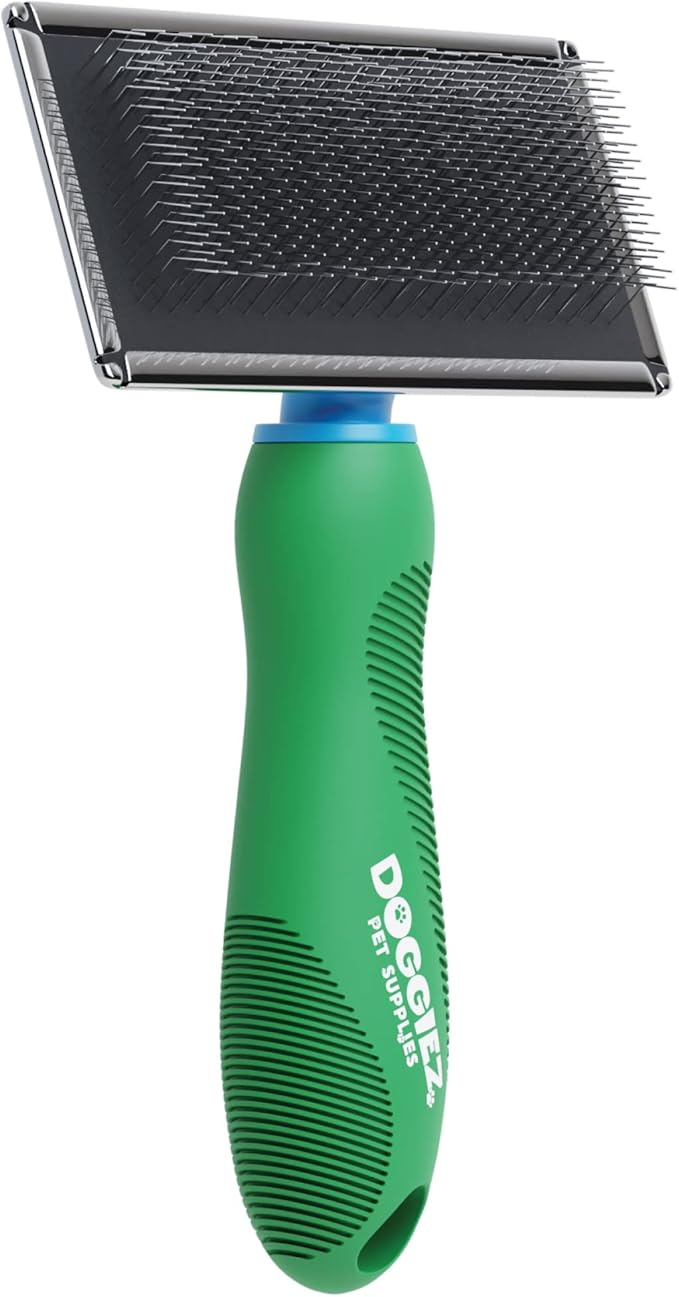 - PRO GROOMING BRUSH - This large heavy duty slicker brush features stainless steel bristle pins that are angled to quickly and easily comb through tangles, knots and matted fur. The slicker brush is especially great for long haired dogs and curly hair breeds like poodles, goldendoodles and labradoodles.