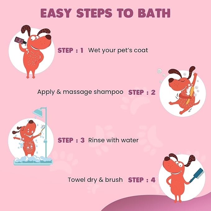 - 【EASY TO APPLY 】: Wet your pet’s coat with lukewarm water. Apply a small amount of shampoo to your pet’s coat. Avoid getting the shampoo in your pet’s eyes, ears, and nose. Use your hands or brush to lather the shampoo & massage it. Rinse your pet thoroughly with water & make sure to remove all the shampoo. Towel dry your pet & brush to remove any tangles.