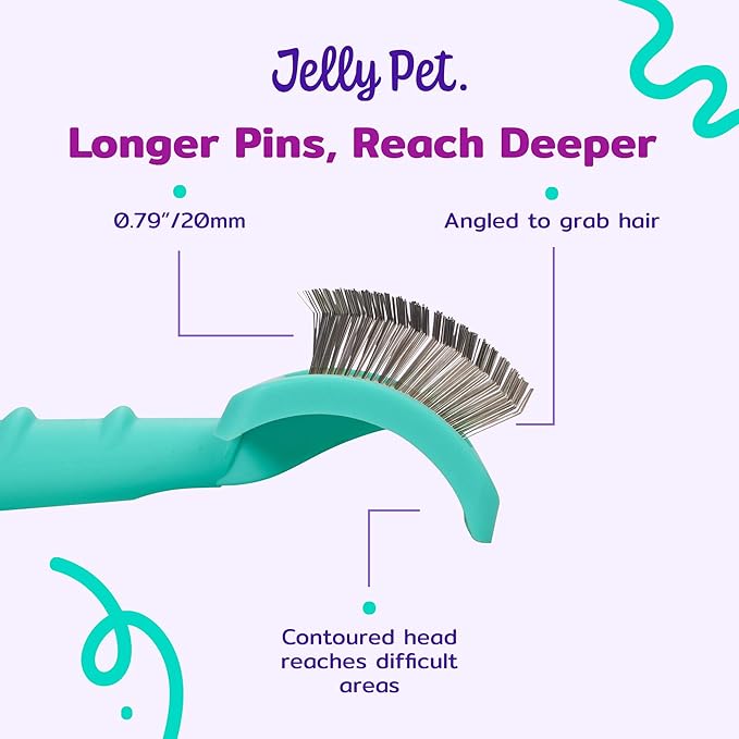 - LONGER PINS - The Jelly Pet Universal Slicker Brush pins are longer than most slicker brush pins and perfectly angled. This "Tuffer Than Tangles" slicker brush allows you to penetrate the coat better and remove more hair. This will also stimulate hair follicles to encourage healthy growth. Each pin reaches more than ¾” deep and is angled at the end to grab the undercoat. Less tangles, and less shedding.
