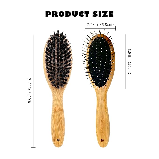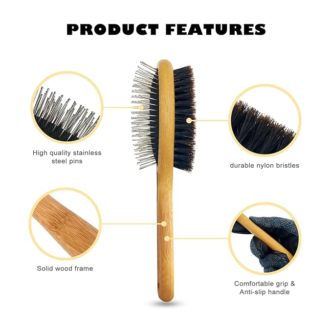 - 🐾TWO IN ONE - This double-sided brush features two brushes and grooming actions in one! Made of lightweight, hard-wearing beech wood. One side includes stainless steel tips with a protective coating to take away lose hair and detangle coat; the other side contains solid nylon bristles to redistribute natural oils for a healthy, shiny coat.