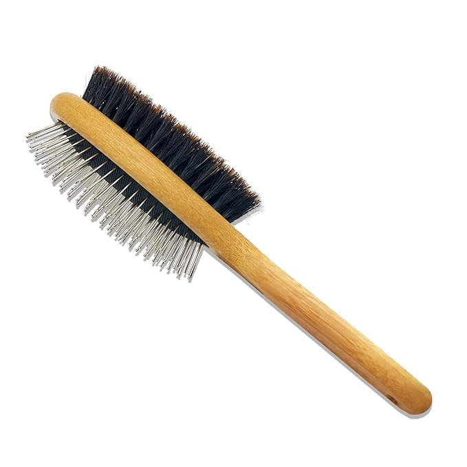 - 🐾TWO IN ONE - This double-sided brush features two brushes and grooming actions in one! Made of lightweight, hard-wearing beech wood. One side includes stainless steel tips with a protective coating to take away lose hair and detangle coat; the other side contains solid nylon bristles to redistribute natural oils for a healthy, shiny coat.