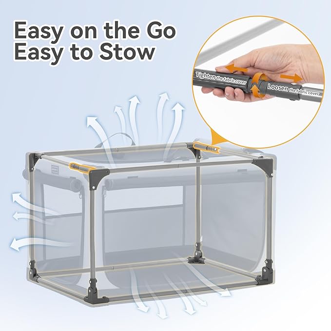 - Our collapsible dog crate features a patented spiral head design that allows you to adjust the tightness of the cloth cover, accommodating slight production variances and multiple washes. This ensures compatibility and a perfect fit. Simply unfold the product, secure the frame, and twist the spiral tubes to complete setup.