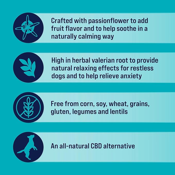- Anxiety Relief: These calming dog treats help relieve your dog’s stress or separation anxiety, made with naturally calming passionflower and valerian root to aid stress relief
