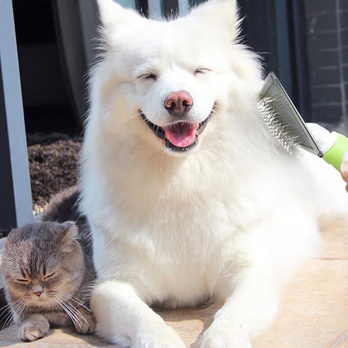 - 【ANTI SCRATCH DESIGN】- The wide-head pet combs won't scratch your dog or cat. The angled pins penetrate deep into the undercoat fur to clear away shedding hair, dander, and dirt. The bristles are long and densely packed, but with softer tips that massage your pet instead of scratching them.