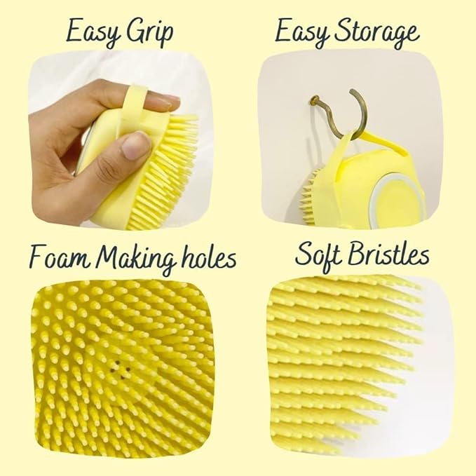 - EASY TO USE: At the top of the bottom, you can open the small ring and pour shampoo and water. When in use, you can press the top silicone button to produce foam. will gently remove loose hair, dust, and dirt. Dog Hair Brush with numerous soft nubs will ensure a no-scratching massage without scratching pet skin and dead fur while bathing.